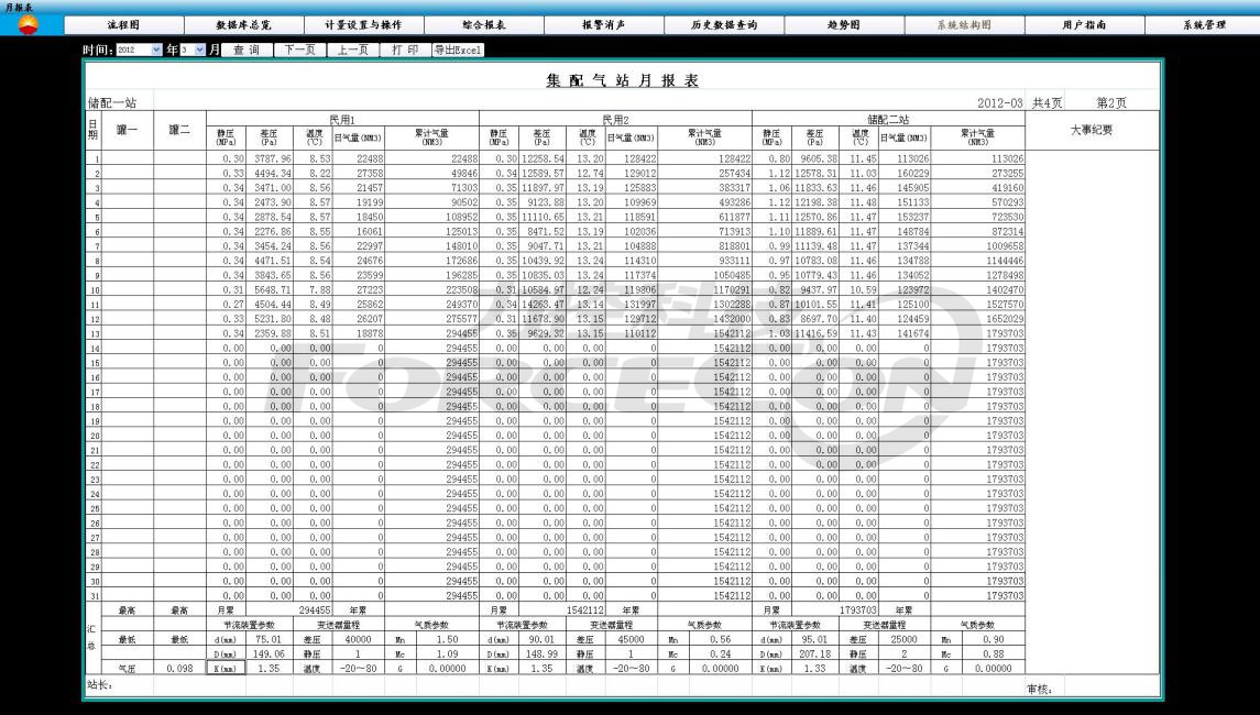 本系統統計各單井、中心站的油壓、套壓、溫度和流量等數據,自動生成符合分公司規范的產量日報、產量月報、計量日報和計量月報。
