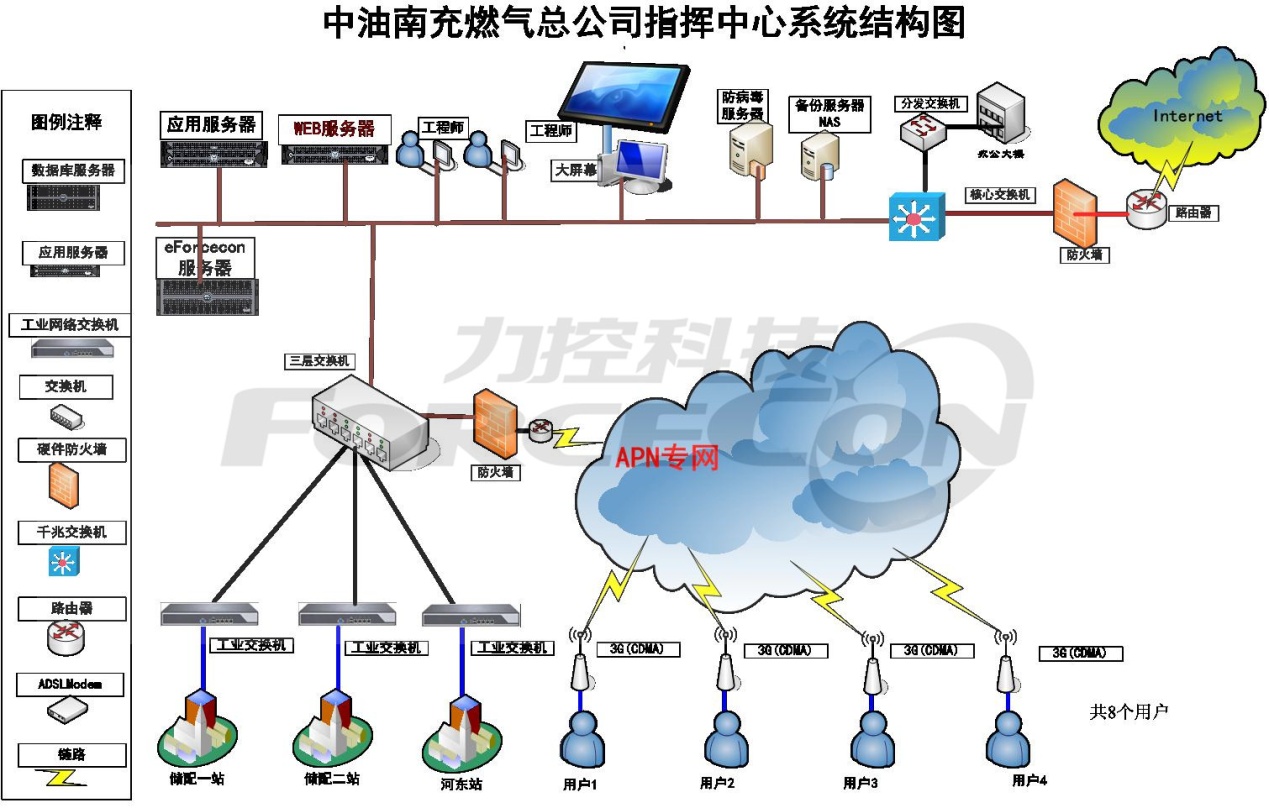 中油南充燃氣有限責任公司生產運行管理系統(調控中心)由儲配一站、儲配二站、河東配氣站以及遠程調壓控制等站控計量系統、遠程視頻系統、通信系統、調控中心設備(包括操作員站、核心服務器、三層交換機、拼接屏顯示設備、供電設備等)以及相應的配套軟件組成。