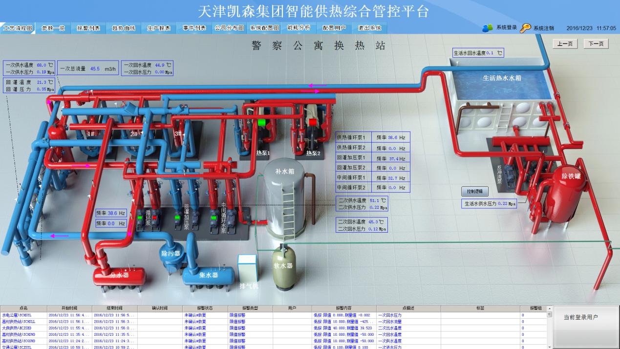 近幾年來,隨著城市的擴容建設,凱森集團在天津地區換熱站已由原來的33座增至64座,原監控系統和軟件已遠遠不能滿足現實需要。隨著凱森集團供熱管網的改造工程逐步深化,所轄換熱站的數量越來越多,供熱面積越來越大,集團集中供熱系統供熱區域廣、供熱面積大,使得各區域的距離遠近、管網質量、供熱設備等硬環境參差不齊,也存在著供熱效率低、供熱不平衡、能量浪費、熱網波動嚴重等諸多問題。傳統的供熱系統多以小區為單位,缺少集中協調和自動化控制;供暖運營水平落后,缺乏自動化和信息化運營,供熱問題難以及時診斷,集團急需通過自動化和信息化的手段改造供熱總控中心,實現轄區所有片區供熱、或多個熱力供熱站的聯合調控。