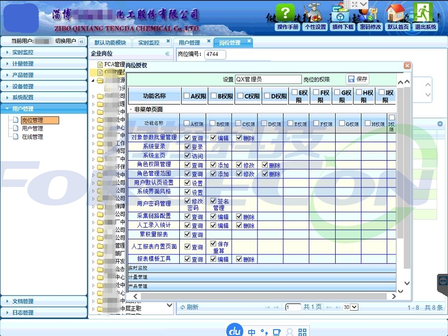 生產信息化系統平臺權限設置基本思想是根據客戶的人事組織架構,以崗位劃分為基礎,對不同崗位的人員授予不同的權限,可以授權到具體某個人可以查看某廠區、工藝段的某工藝畫面和能源報表等,結合不同崗位人員關注方向,形成一人一看板。信息平臺的系統用戶登錄數量是不受限制的,即通過瀏覽器登錄信息平臺的用戶數量不做限制,具體到某一用戶的權限可以根據現實的需求做具體的授權。