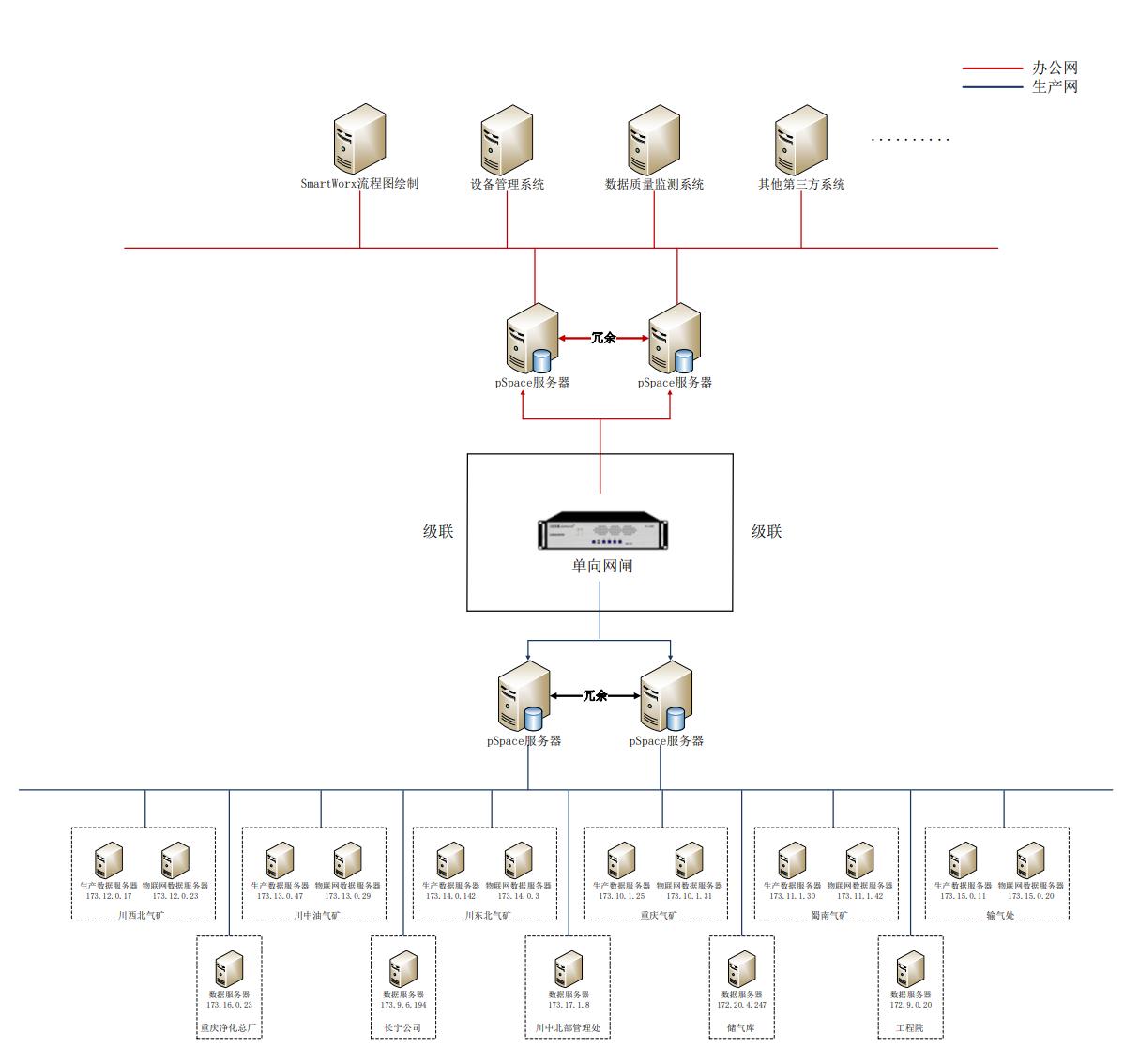 系統(tǒng)主要包括pSpace實(shí)時(shí)歷史數(shù)據(jù)庫、FSmartWorx云端可視化軟件、資產(chǎn)設(shè)備建模系統(tǒng)、數(shù)據(jù)質(zhì)量分析系統(tǒng)。需要配備的硬件包括實(shí)時(shí)服務(wù)器(熱備冗余)、歷史服務(wù)器(熱備冗余)、磁盤陣列柜、Web服務(wù)器、UPS電源、網(wǎng)絡(luò)設(shè)備等;層級之間配備了隔離網(wǎng)關(guān)等安全設(shè)備保證系統(tǒng)信息安全。