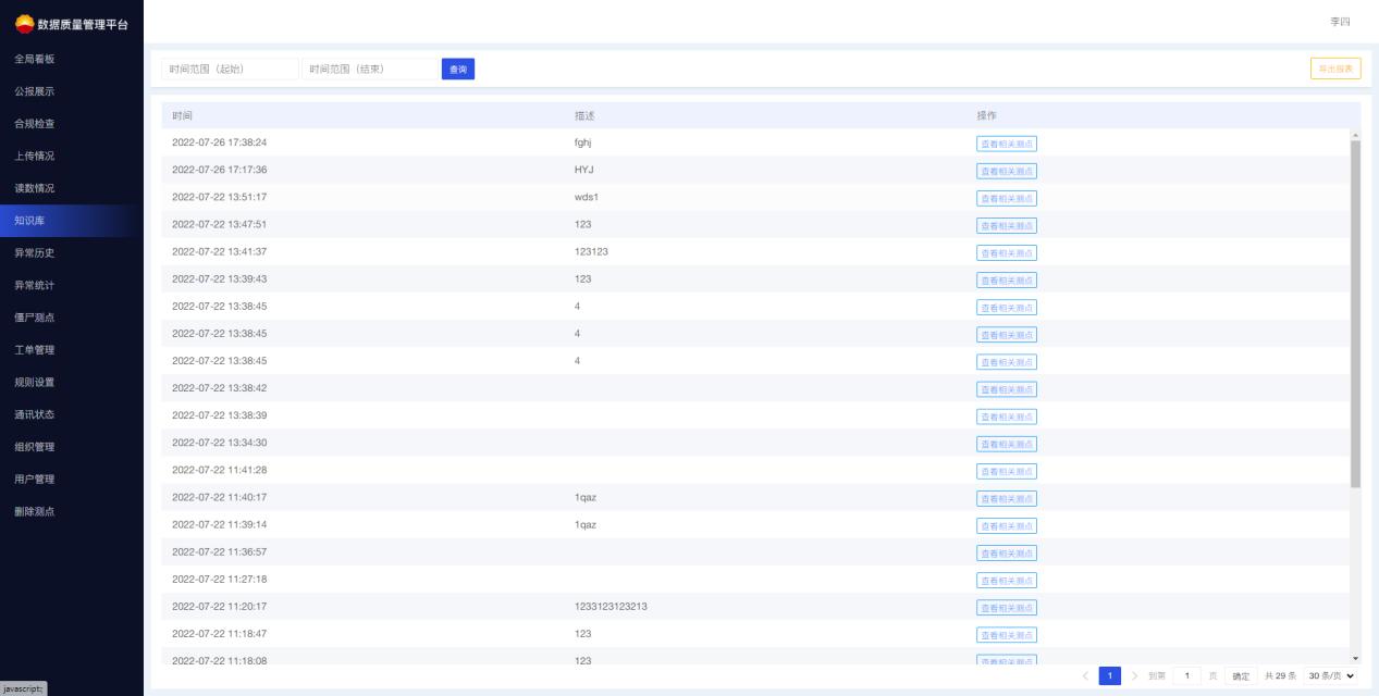 知識庫為“上傳情況”和“讀數(shù)情況”中異常測點(diǎn)備案的數(shù)據(jù)點(diǎn),當(dāng)我們使用“異常測點(diǎn)備案”時(shí),所有備案的異常點(diǎn)都會顯示在“知識庫”中。