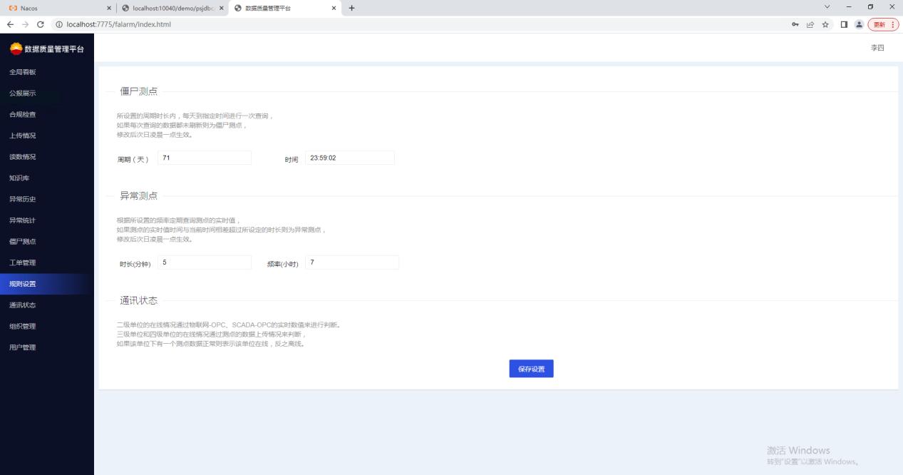 規(guī)則設(shè)置為僵尸測點(diǎn)、異常測點(diǎn)和通訊狀態(tài)的判斷規(guī)則,可在此處設(shè)置僵尸測點(diǎn)判斷的周期和指定時(shí)間;還可設(shè)置異常測點(diǎn)的指定頻率和相差時(shí)間。修改之后次日凌晨1點(diǎn)生效。