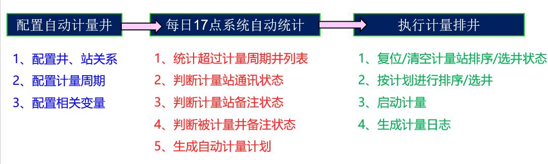 常規(guī)的計(jì)量方式需要先完成計(jì)量計(jì)劃的制定,然后向計(jì)量人員下發(fā),計(jì)量人員按照紙質(zhì)計(jì)量計(jì)劃單進(jìn)行手動(dòng)選井計(jì)量,單手動(dòng)選井計(jì)量的工作就需要1~2人每天花費(fèi)30分鐘以上的時(shí)間才能完成,且不保證存在人為疏忽的可能性。本次開發(fā)的自動(dòng)計(jì)量功能,最終可實(shí)現(xiàn)人工預(yù)配置單井計(jì)量周期,系統(tǒng)每日17點(diǎn)自動(dòng)進(jìn)行統(tǒng)計(jì)哪些井超過預(yù)定時(shí)間,系統(tǒng)自動(dòng)將超過預(yù)定時(shí)間的井進(jìn)行排井計(jì)量。