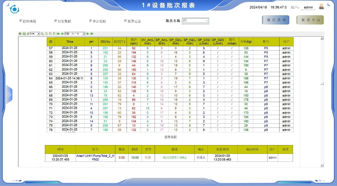 批次報表功能具備高靈活性與便捷性,支持依據批次進行檢索,能夠展示整個批次的全部關鍵性數據,包含趨勢曲線、歷史數據、審計追蹤、報警記錄等功能,此外,用戶可以根據實際需求勾選預覽相關數據項,以便快速獲取想要的數據,支持將批次報表內容以PDF格式進行定制化打印輸出。