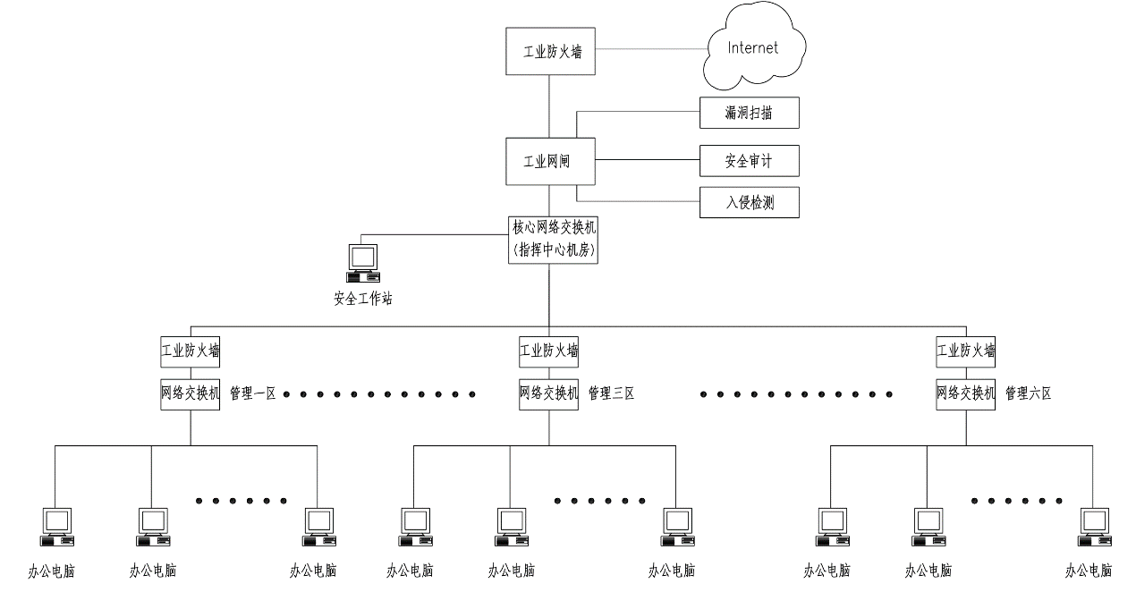 在核心交換機(jī)(指揮中心機(jī)房)與因特網(wǎng)之間采用工業(yè)網(wǎng)閘,在進(jìn)行網(wǎng)絡(luò)物理隔離的同時(shí)實(shí)現(xiàn)了數(shù)據(jù)實(shí)時(shí)上傳,徹底阻斷了來自外網(wǎng)對工控網(wǎng)絡(luò)的安全威脅。