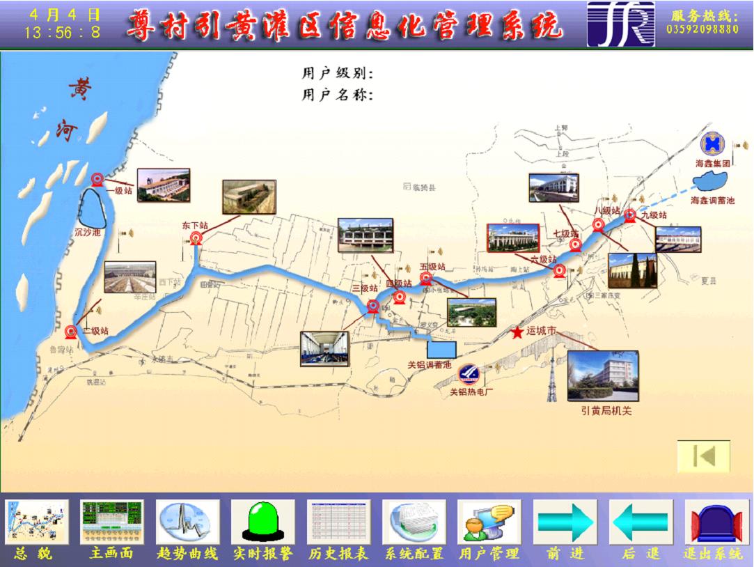 山西運城該項目取水來源為黃河,黃河由于泥沙較大,對設備要求相對較高,山西運城水處理系統(tǒng)共設監(jiān)控中心一處,位于引黃管理局機關內,泵站現場監(jiān)控點12處,分別位于尊村引黃一級站至九級站、東下站、海鑫供水站、關鋁熱電廠供水站等?! ?/span>