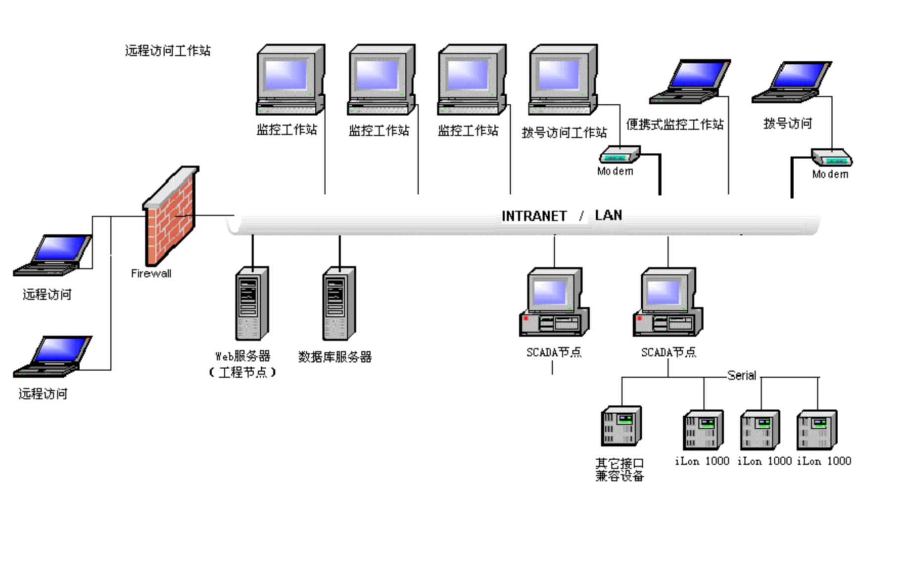 圖中的SCADA節(jié)點就是監(jiān)控節(jié)點,即負(fù)責(zé)數(shù)據(jù)采集、設(shè)備控制和狀態(tài)顯示的監(jiān)控計算機(jī),監(jiān)控節(jié)點(SCADA節(jié)點)直接與設(shè)備進(jìn)行實時通信。監(jiān)控節(jié)點物理上通過串口、以太網(wǎng)或其它通信接口來連接硬件設(shè)備,典型的設(shè)備包括PLC、控制器、直接數(shù)字控制系統(tǒng)(DDC)、分布式控制系統(tǒng)(DCS)和IO系統(tǒng),但在大型的網(wǎng)絡(luò)系統(tǒng)中監(jiān)控節(jié)點通常不是一個Web 服務(wù)器,監(jiān)控節(jié)點是直接連接到一個下位控制系統(tǒng)的計算機(jī)。