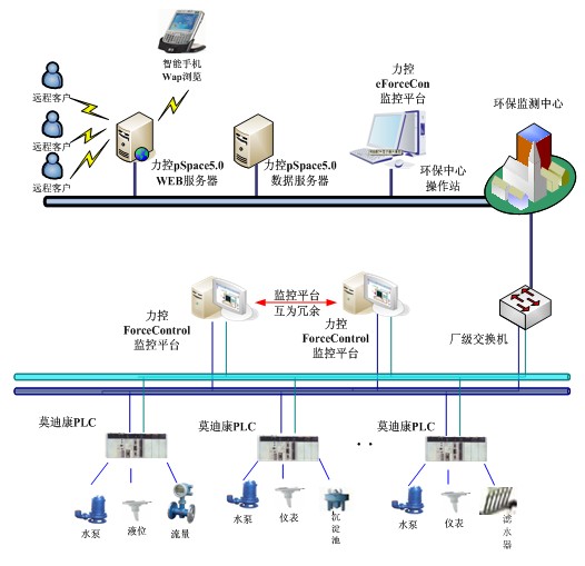 以力控監(jiān)控組態(tài)軟件eForcecon、實時歷史數(shù)據(jù)庫pSpace為系統(tǒng)平臺,結(jié)合垃圾處理填埋過程中滲液處理的工藝要求,實現(xiàn)了實時監(jiān)控垃圾滲夜處理、遠(yuǎn)程部署管理處理設(shè)備以及環(huán)保數(shù)據(jù)與環(huán)境管理部門無縫集成,降低了垃圾滲夜處理過程中生產(chǎn)維護(hù)與管理的成本。