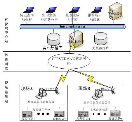 污染源在線自動監(jiān)控系統(tǒng)從底層向上可分為污染源現(xiàn)場監(jiān)測站、傳輸網(wǎng)絡和環(huán)保局中心站三個層次(如圖示)。
