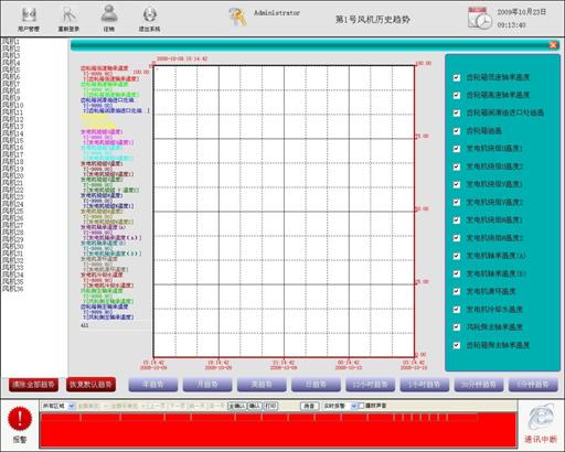 1) 系統(tǒng)的監(jiān)控畫面顯示風(fēng)場(chǎng)所有風(fēng)機(jī)、電網(wǎng)線路、以及其他設(shè)備的運(yùn)行情況,重要的運(yùn)行工況畫面通過一次擊鍵調(diào)出,調(diào)出時(shí)間小于0.5S;調(diào)出任何一幅畫面擊鍵不超過三次,每幅畫面能顯示過程變量的實(shí)時(shí)數(shù)據(jù)和設(shè)備狀態(tài),這些數(shù)據(jù)和狀態(tài)每秒更新一次,顯示的顏色或圖形隨過程工況而變化。系統(tǒng)提供的畫面數(shù)量、每幅畫面的圖素及實(shí)時(shí)更新和被控的過程點(diǎn)幾乎不受限制。系統(tǒng)提供標(biāo)準(zhǔn)的顯示畫面,如風(fēng)場(chǎng)總覽顯示、風(fēng)機(jī)列表顯示、趨勢(shì)顯示、成組顯示、棒狀圖顯示等標(biāo)準(zhǔn)畫面。