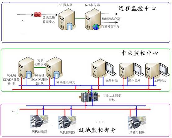 在中央控制室設(shè)立了一對(duì)互為熱備的實(shí)時(shí)數(shù)據(jù)庫(kù)服務(wù)器,采集和保存所有的現(xiàn)場(chǎng)數(shù)據(jù),同時(shí)作為報(bào)警服務(wù)器和事件服務(wù)器;根據(jù)需要設(shè)立一定數(shù)目的客戶端節(jié)點(diǎn),作為操作員站;設(shè)立一臺(tái)工程師站作為組態(tài)和維護(hù)。風(fēng)場(chǎng)中央監(jiān)控中心布置在風(fēng)電場(chǎng)控制室內(nèi),工作人員根據(jù)切換畫面隨時(shí)控制和了解風(fēng)電場(chǎng)同一型號(hào)風(fēng)力發(fā)電機(jī)的運(yùn)行和操作。風(fēng)場(chǎng)監(jiān)控中心通過風(fēng)電場(chǎng)光纖以太網(wǎng)環(huán)路與就地控制室的系統(tǒng)進(jìn)行通訊。