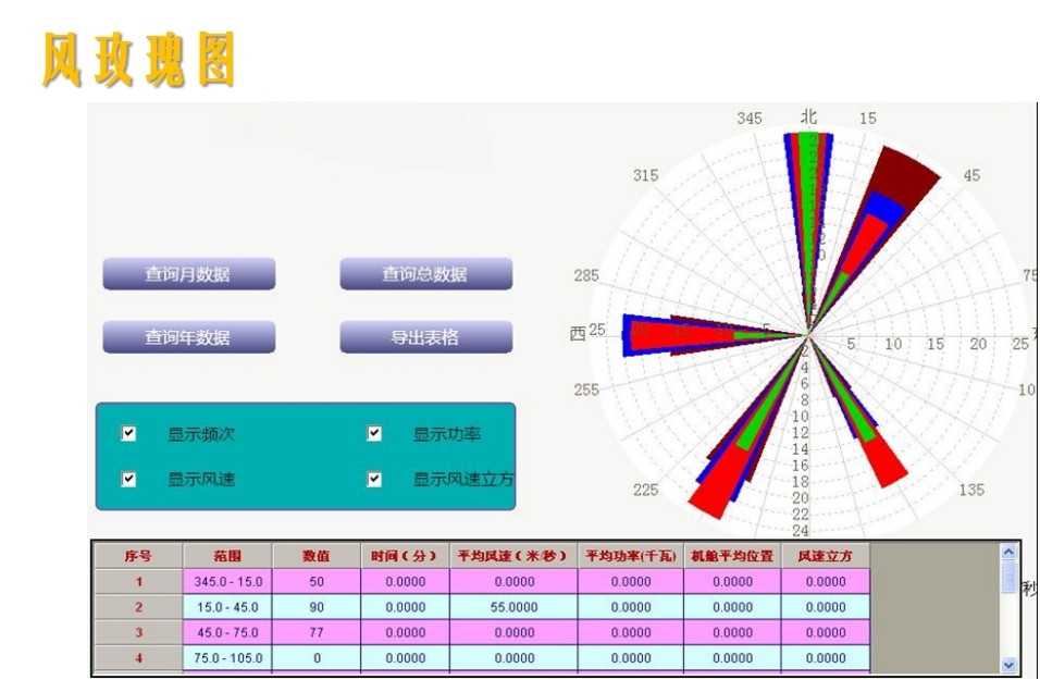 ② 系統(tǒng)顯示各臺機組的運行數(shù)據(jù)。如每臺機組的瞬時發(fā)電功率、累計發(fā)電量、發(fā)電小時數(shù)、風輪及電機的轉速和風速、風向等,將下位機的數(shù)據(jù)調入上位機并顯示,必要時還可以用曲線或圖表的形式直觀地顯示出來。