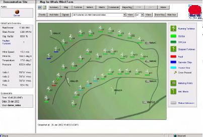 ③ 系統(tǒng)顯示各風電機組的運行狀態(tài)。如開機、停車、調向、手/自動控制以及大/小發(fā)電機工作等情況,通過各風電機組的狀態(tài)了解整個風電場的運行情況。