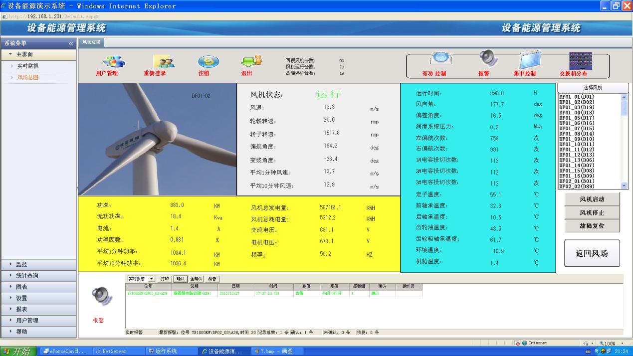 1) 顯示機(jī)組的運(yùn)行數(shù)據(jù),如機(jī)組的瞬時(shí)發(fā)電功率、累計(jì)發(fā)電量、發(fā)電小時(shí)數(shù)、風(fēng)輪及電機(jī)的轉(zhuǎn)速和風(fēng)速、風(fēng)向等,用風(fēng)玫瑰圖、曲線或圖表的形式直觀地顯示出來。