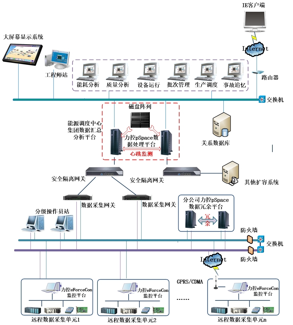 力控科技為企業EMS能源管理系統提供了綜合解決方案,典型能源系統架構包括能源調度管理中心、通訊網絡、遠程數據采集單元等三級物理結構,其中信息采集與防護特點如下: