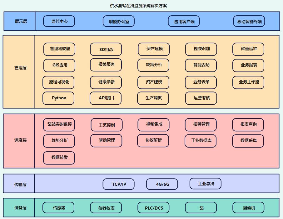 智慧供水泵站系統(tǒng)架構(gòu)分為五層:設(shè)備層是供水泵站的基礎(chǔ)硬件部分;傳輸層承擔(dān)數(shù)據(jù)與指令的傳輸任務(wù);調(diào)度層是整個(gè)供水泵站的智能中樞,它接收來自傳輸層的設(shè)備運(yùn)行數(shù)據(jù)與供水需求信息,基于內(nèi)置智能算法與調(diào)度模型進(jìn)行綜合分析與運(yùn)算;管理層為泵站管理人員提供全面的運(yùn)營管理功能;展示層提供系統(tǒng)與用戶交互的界面,管理人員可一目了然地了解泵站運(yùn)行全貌。