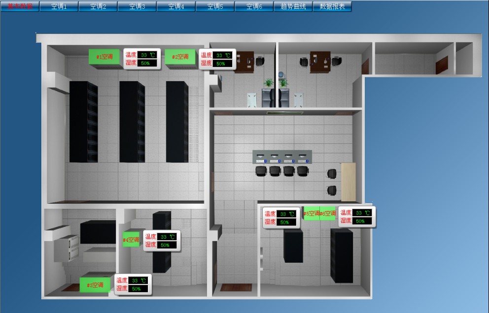 為了解決上述問題,本系統的設計和建設目的是實時監測機房環境的各項指標,遇到機房停電、電源故障、環境溫度過高、空調運行異常、空調停機、非法闖入、火災和漏水等緊急意外情況,能夠及時記錄、查詢和自動快速報警。采用計算機、通信、網絡、四遙(遙測、遙信、遙控、遙視)技術,利用現有的Internet網絡環境,構成一個一體化、網絡化的集中監控系統,可以在計算機屏幕上看到監控點的圖形畫面,了解監控點的信息,提高機房的可靠運行能力,提升機房日常維護效率,降低維護成本和勞動強度。
