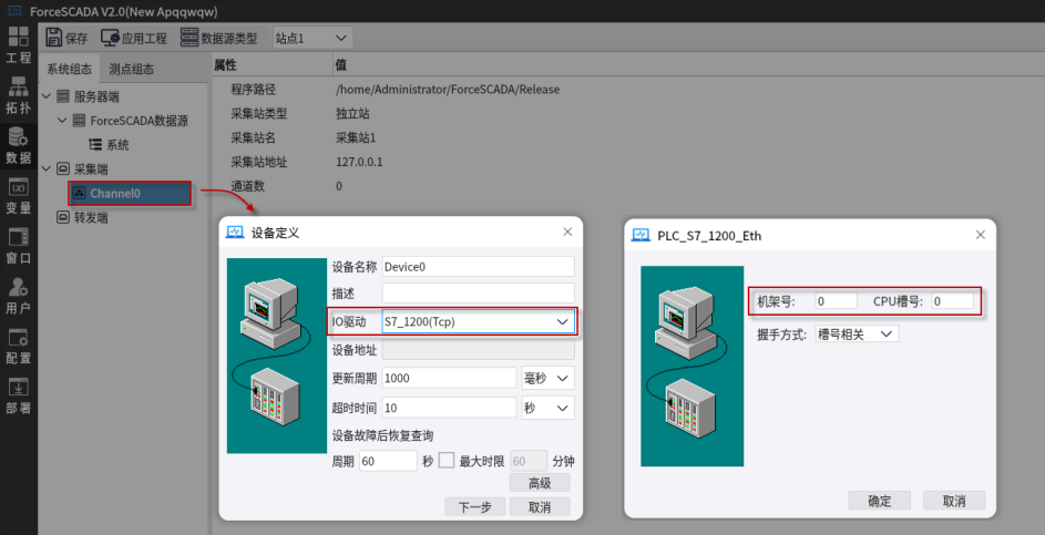 右擊通道-新建設備-IO驅動(S7-1200TCP)-機架號和CPU槽號(根據設備填寫)