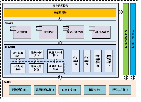 分為三個獨立的程序模塊,分別為:服務進程模塊、界面展示模塊、日志審計模塊。服務進程為系統實現的核心模塊,系統所有的功能均由主服務進程來實現;界面展示模塊負責用戶交互;日志審計模塊負責日志的查詢及統計。