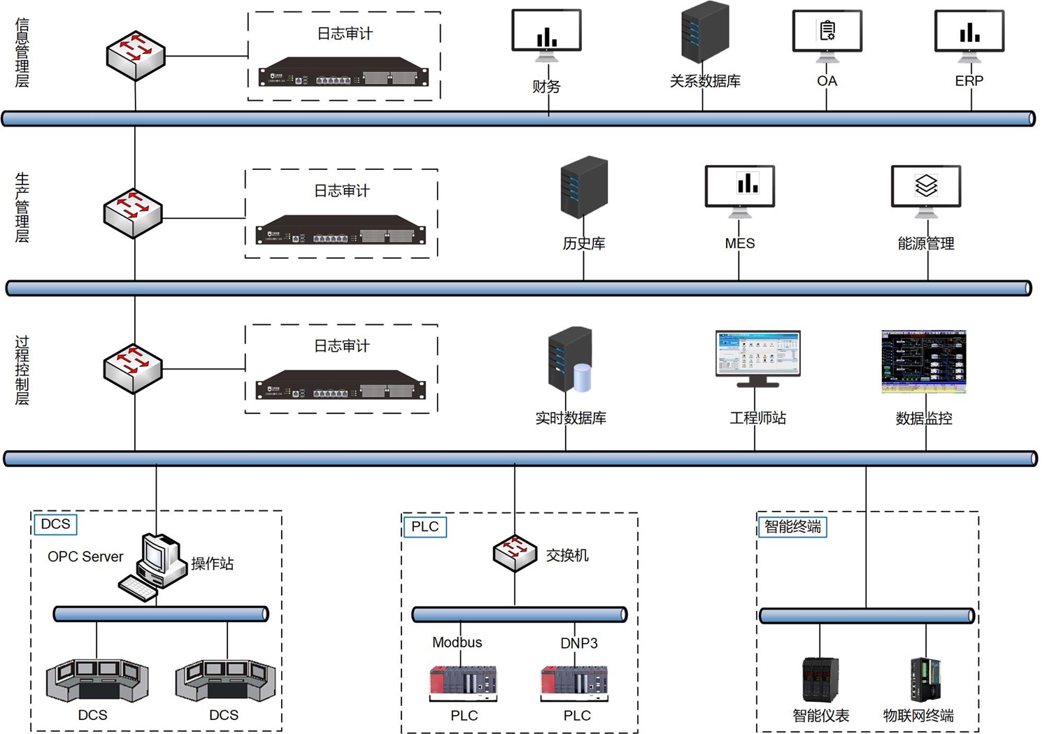 在信息管理層、生產管理層和過程控制層部署日志審計,通過收集并分析系統日志等數據,從而發現違反安全策略的行為。安全審計主要側重于事后分析,即當發生安全事故或者發生違反安全策略的行為之后,通過檢查、分析、比較審計系統收集的數據,從中發現違反安全策略的行為。