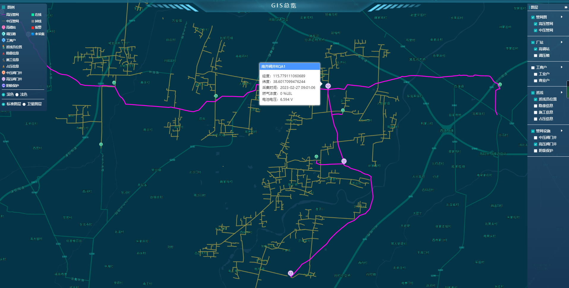 通過地理圖形實現對管網設備資源的管理和定位,集成SCADA系統數據和遠程視頻監控圖像實現對管網資源的實時監控,實現對管網區域中危險源的登記和施工信息的管理,實現對人員的跟蹤和對車輛的實時監控,為綜合調度指揮服務。