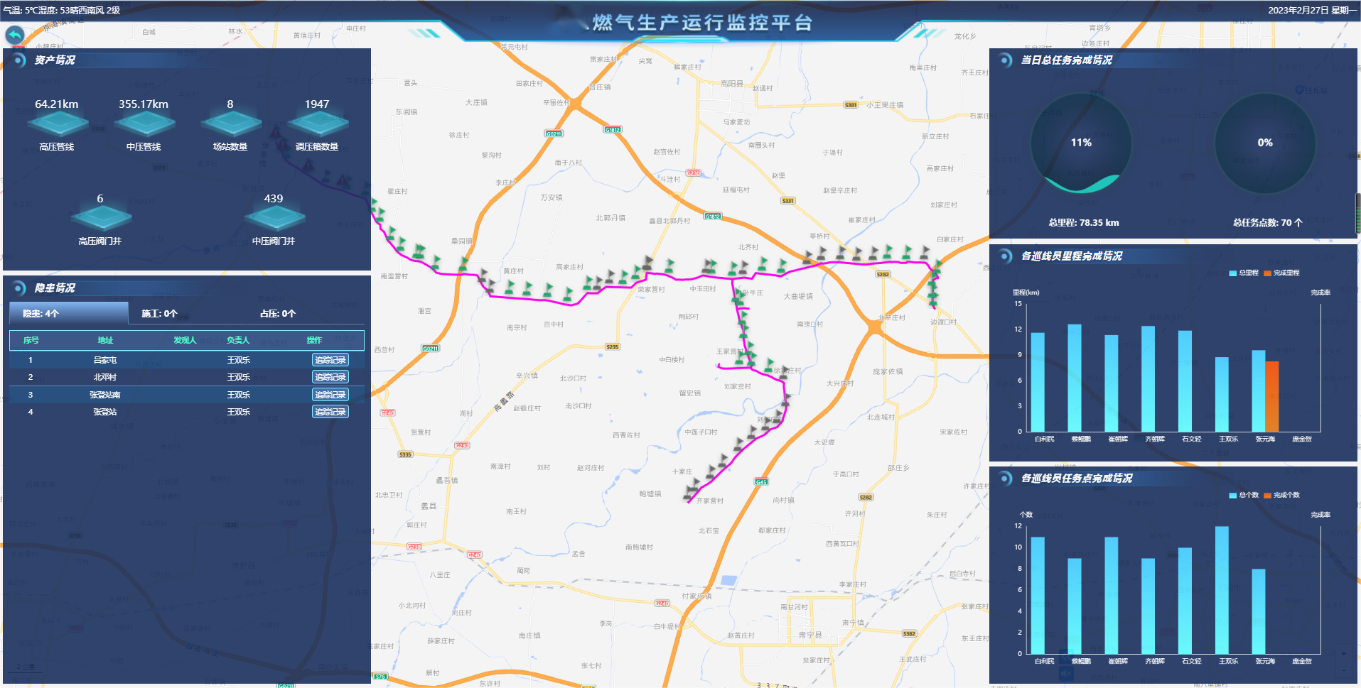 管線巡檢主要實現場站巡檢管理、長輸管線、城市管網巡線管理以及遠程交接班管理。該功能模塊主要包括路線繪制、計劃制定、計劃分配、巡線監控、軌跡回放、隱患上報、任務統計分析等。