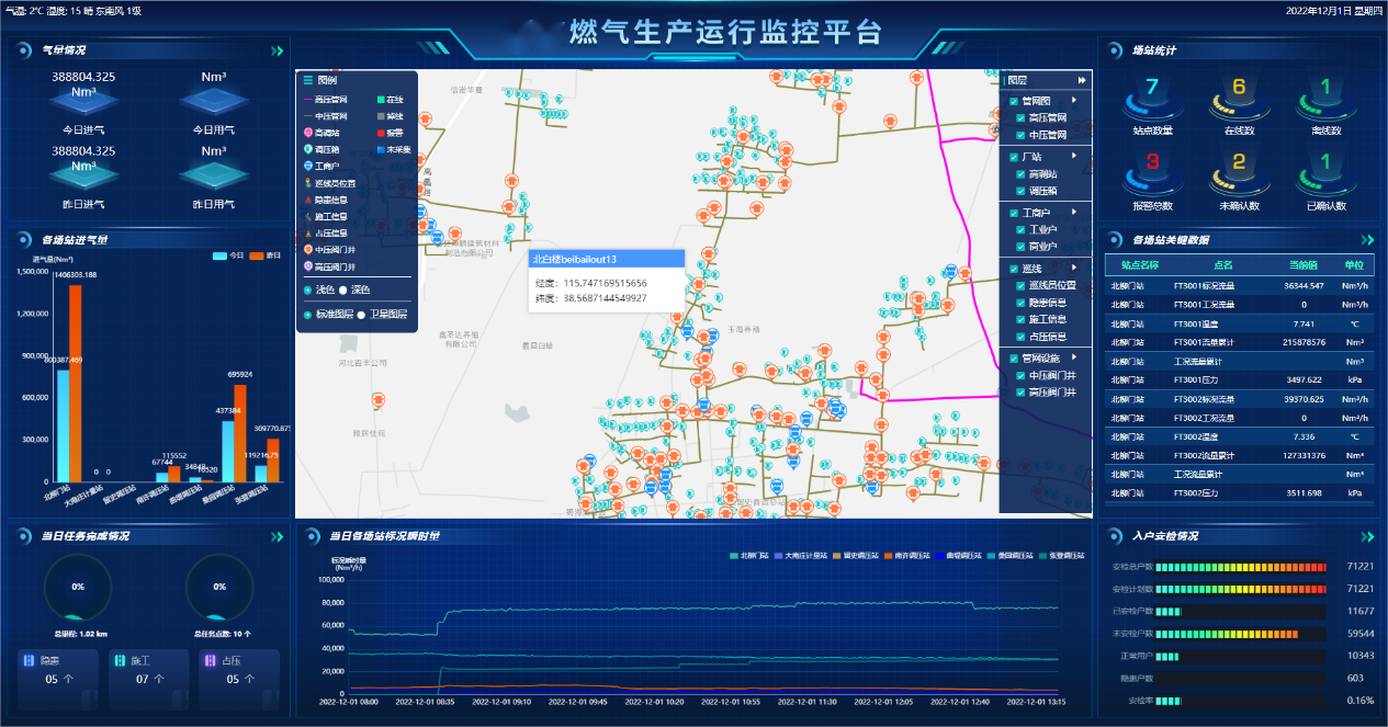 生產運行監控主要借助SCADA系統將分布在管轄區域內場站、閥室、調壓站、用戶、加氣站所采集的管網設備的運行參數匯集上來,從而掌握整個管網的運行情況,并對運行設備進行實時監控。系統出入口采用GIS地圖和場站檢索組合方式,可通過地圖查看也可通過搜索進入該場站。